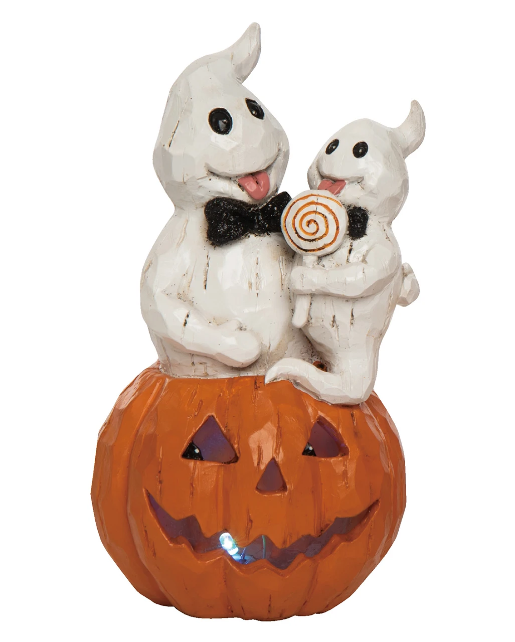 Kinderfreundliche Halloween Deko Figur mit zwei Gespenstern auf einem leuchtendem Kürbis