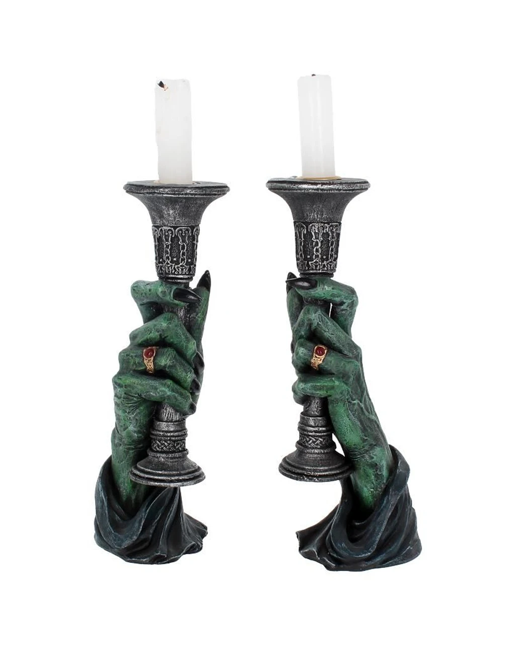 Stell die Gothic Kerzenhalter – Light of Darkness auf den Esstisch oder die Fensterbank. Sie geben dort einen tollen Blickfang ab. Die beiden Kerzenständer sind aus Polyresin gegossen und von Hand bemalt. Es sieht so aus, als wären sie von zwei Vampirhänden mit langen Fingernägeln umschlungen worden. Diese ragen scheinbar aus deinem Tisch und halten die Ständer fest.