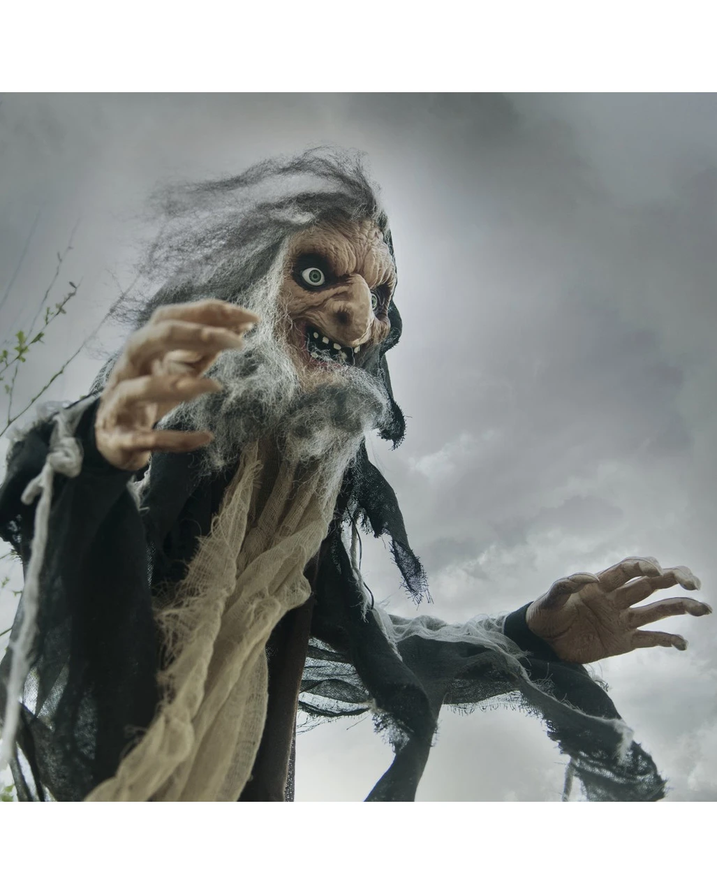 Betrete bei Vollmond niemals das Moor, denn dort, im dunklen Sumpf zwischen den alten Bäumen, wartet das Verderbe. Wenn ein markerschütternder Schrei die Nacht zerreißt, dann hat Nahema wieder zugeschlagen. Die böse Moorhexe zieht jeden in ihr Reich, der zu nahe kommt…Die Halloween Figur Hexe Nahema ist 163 cm groß und eine Halloween Animatronic Hexe mit Bewegung, Sound und Licht. Ihre weit aufgerissenen Augen blinken rot und wirken besonders gruselig. Dabei stößt sie boshaftes Hexengelächter aus, und ihr Kopf bewegt sich auf und ab. Das von Falten zerfurchte Gesicht zeigt einen fast zahnlosen Mund. Ihre grau-schwarzen Haare hängen wirr herab, genauso wie ihr Kleid, das mit ihr gealtert ist.