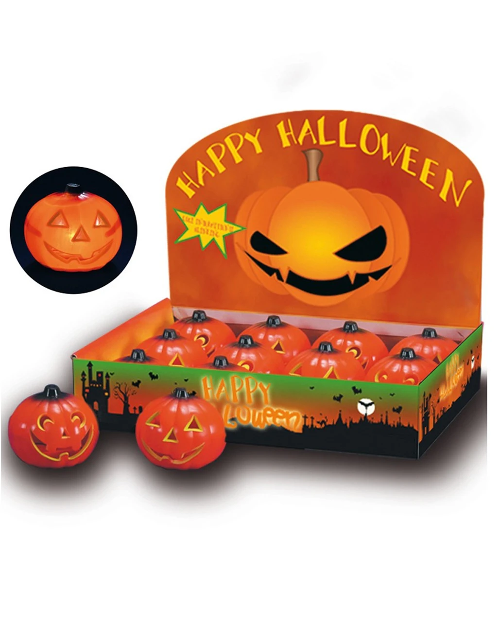 Der kleine frech-grinsende Kürbis ist die ideale Dekoration für jedes Fenster, den Tisch oder als Mitbringsel für den Gastgeber einer Halloweenparty. Mit dem leuchtenden Kürbis auf der Fensterbank oder im Eingangsbereich signalisierts du den kleinen Geistern und Hexen das sie bei dir willkommen sind und es dort was zu Naschen gibt. Der kleine, blinkende Kürbis ist eine günstige und trotzdem stillvolle Halloweendekoration für alles Gruselfans.