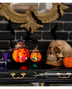 Besonders stimmungsvoll wirkt unsere Kürbis Glas Laterne für Halloween. Ob am Tisch oder auf der Fensterbank: Der kleine Jack O´Lantern schmunzelt dir freundlich entgegen und verbreitet als Halloween Kerzenhalter mystisches Licht. Die Laterne im Kürbis Design lässt sich wunderbar mit Trockenblumen, gruseligen Vasen oder Spinnweben arrangieren. Auch im Halloween Buffet macht sich der gläserne Kürbis hervorragend!