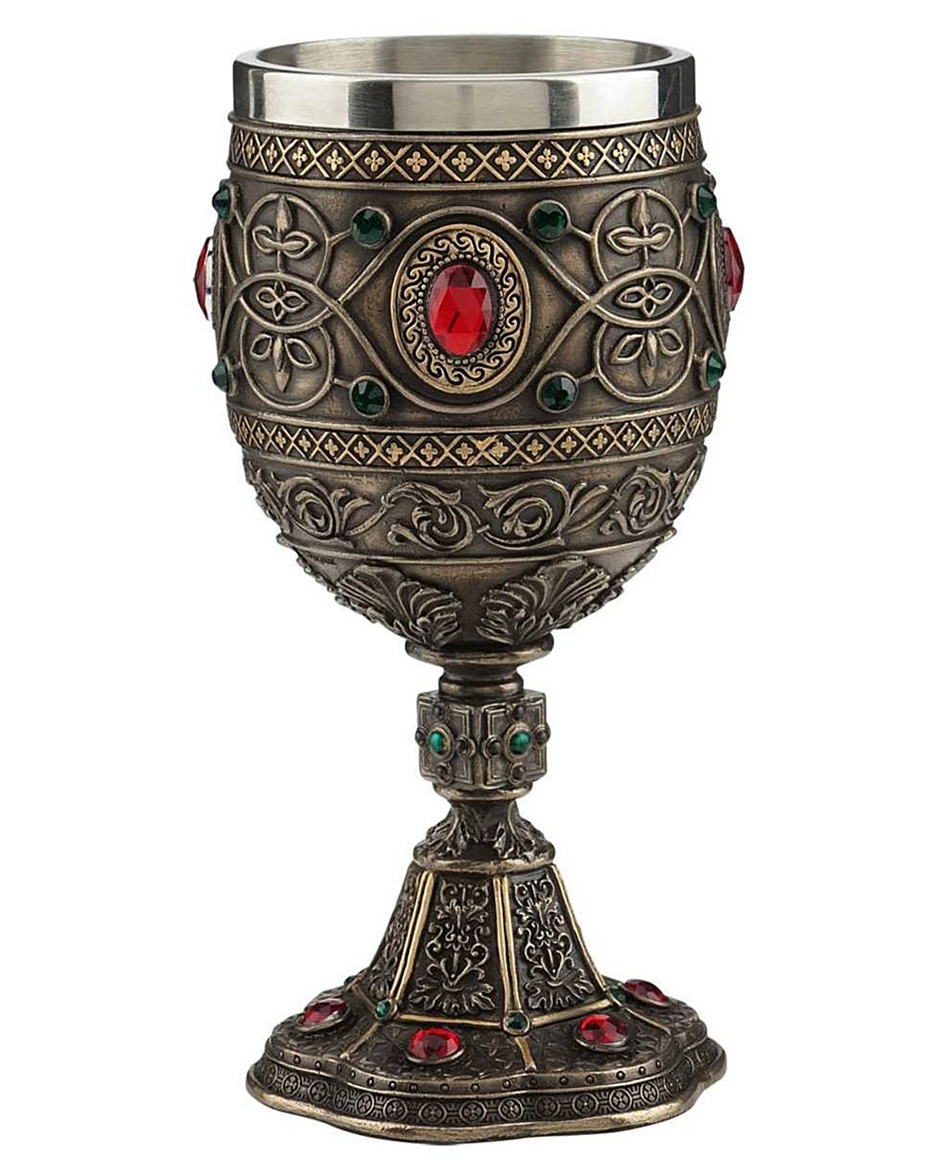 Der bronzefarbene Ritter Kelch mit Metalleinsatz ist mit zahlreichen Verzierungen und roten Kunststeinen versehen. Dank des antiken Looks macht sich die hochwertige Deko auch gut an Halloween. Passend zu der Legende um den geschichtsträchtigen Kelch empfehlen wir unser König Artus Herrenkostüm und das Ritter Schwert.