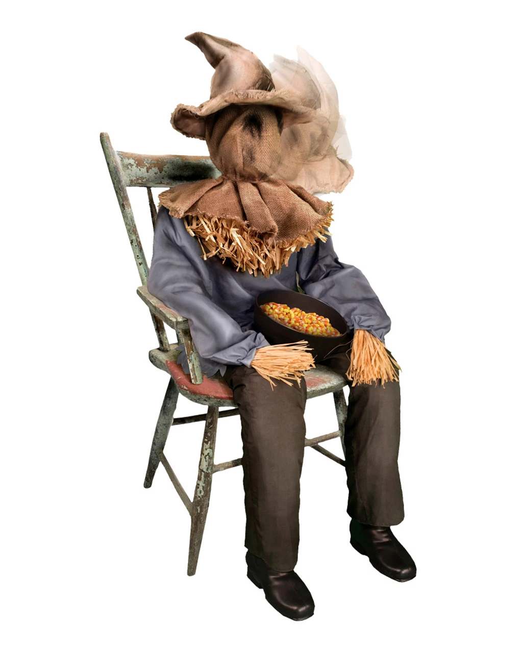 Du suchst einen echten Schocker, der Deine Gäste noch überraschen und erschrecken kann? Für Dein nächstes Halloween soll es etwas außergewöhnliches sein? Die sitzende Vogelscheuche mit Schnappkopf ist die Antwort auf Deine Fragen. Augelöst durch Bewegungs- und Geräuschmelder schnappt der Kopf der gruseligen Vogelscheuche nach oben, sobald jemand die Hand in die Süßigkeitenschüssel streckt. Dabei bricht die Horror-Scarecrow in grausames Gelächter aus – um die Atmosphäre Deiner Halloween-Party musst Du Dir hiermit keine Sorgen machen.