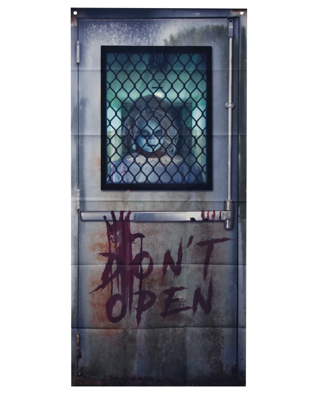 durch das Fenster herein sehen. Die Falsche-Tür mit Psycho Killer Motiv und blutigem Hinweis „Don`t Open“ kann auf eine bereits vorhandene Türe gehängt werden oder du hängst die vermeintliche Tür an die Wand und erzeugst damit die Illusion von einem zusätzlichen Ausweg.
