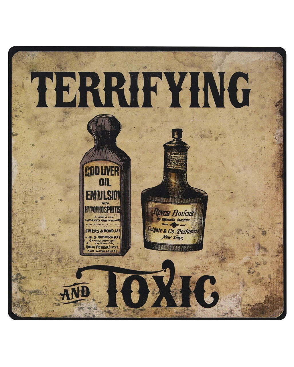 Ausgefallenes Schild im Antik Style längst vergangener Zeit. Das Metallschild zeigt zwei Giftflaschen und den Satz „Terrifying and Toxic „