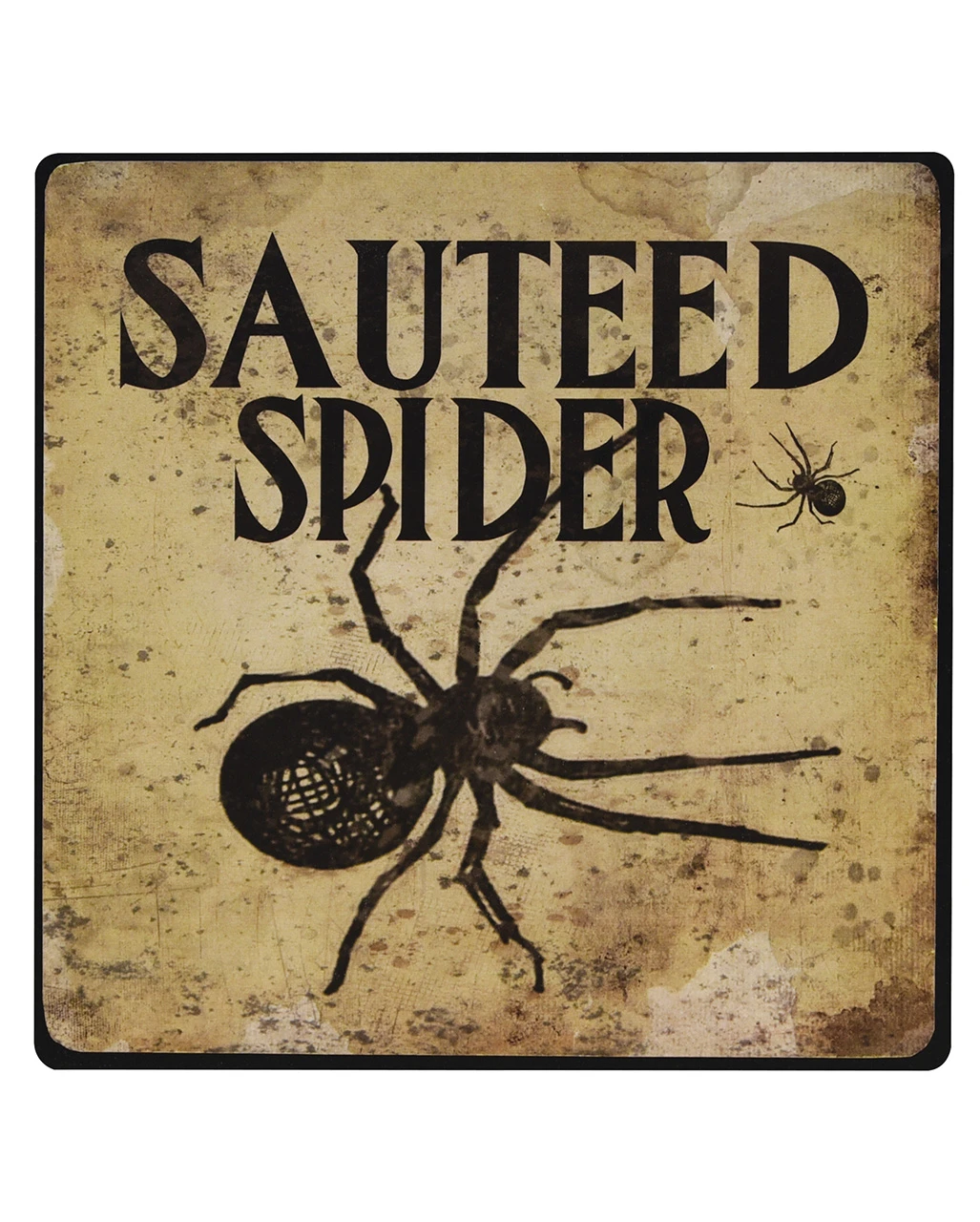 Ausgefallenes Schild im Antik Style längst vergangener Zeit. Das Metallschild zeigt eine schwarze Spinne und den Satz „Sauteed Spider“